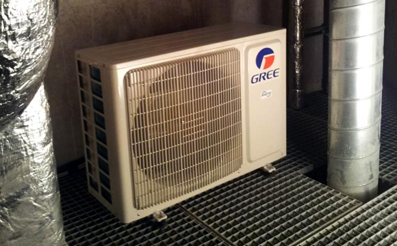 Innengerät auf Konsole mit Zu- und Abluft durch das umgebaute Fenster im Serveraum montiert da keine Montage ausserhalb möglich war. - Serverraum DB